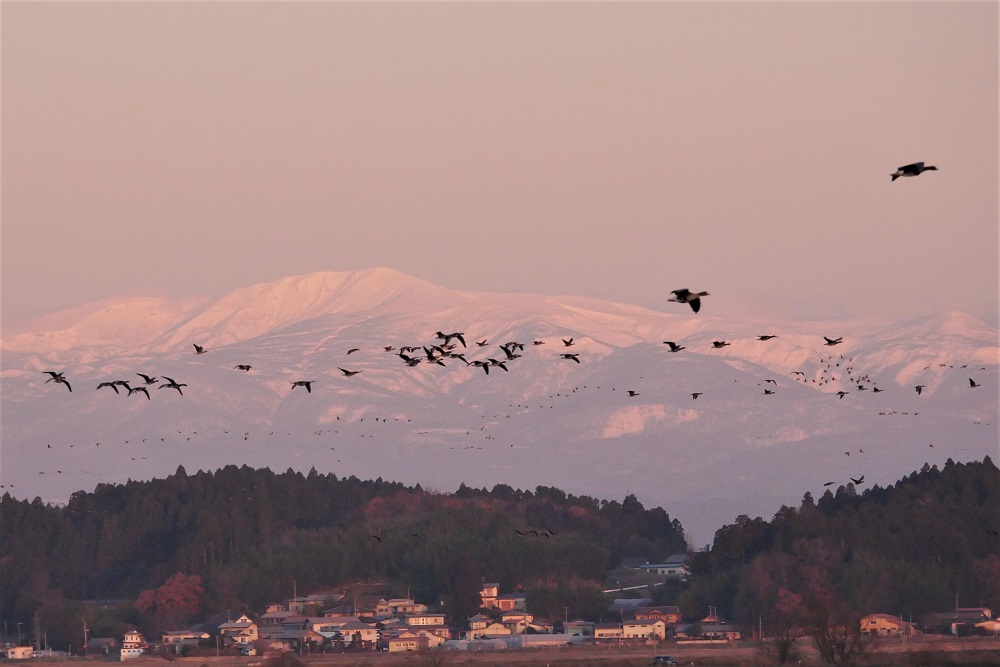 モルゲンローテの栗駒山と朝日に染まるマガン