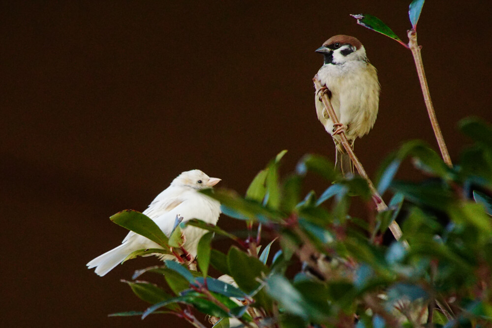 普通のスズメと白スズメ